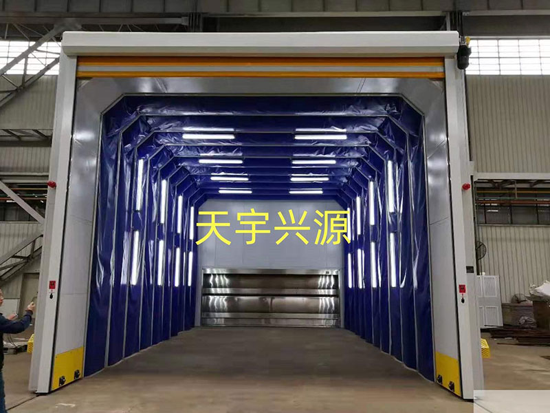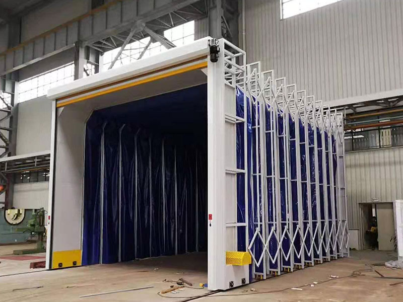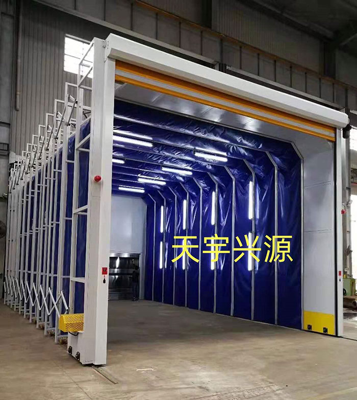 特点:伸缩移动喷漆前室和无泵水幕喷漆室结合使用,是解决重型工件喷漆时移动难的问题,而活动喷漆前室就克服这个问题。工作时将活动前室收缩,用天车将重型工件吊运到喷漆场地,再将活动前室展开,罩住工件,即可工作。喷漆后再将前室收缩,用天车将工件吊离,不影响天车的工作。